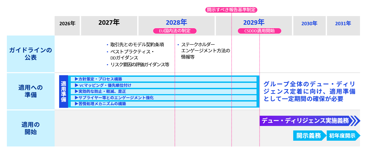 2029年7月のCSDDD適用開始に向けては、デュー・デリジェンス実施に関する各種ガイドラインの公表が予定されているため、現在の準備期間を有効に活用し、求められる水準に向けた体制整備を進める必要があります。(図表5)