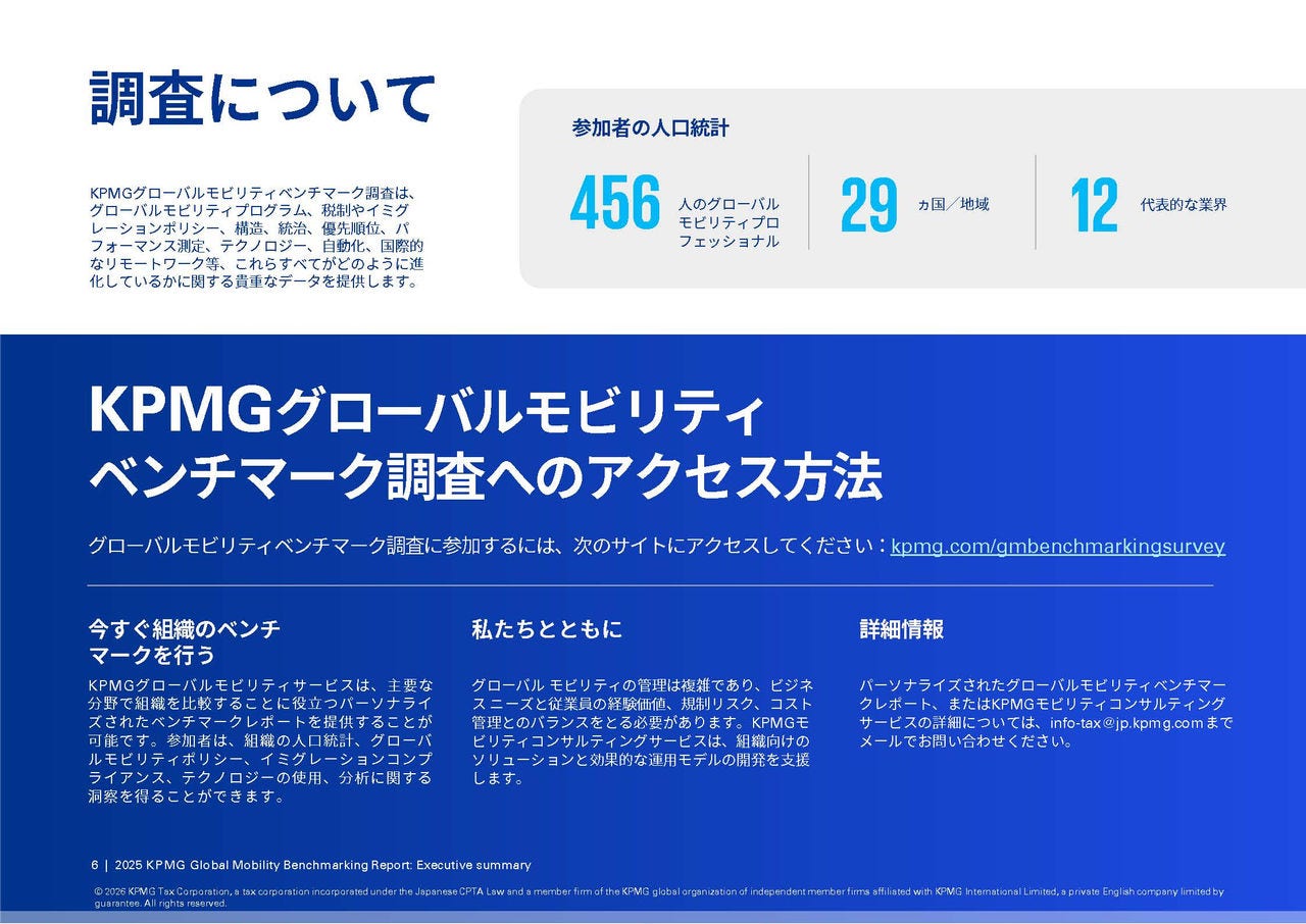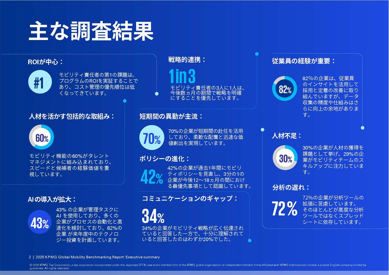 このたび、KPMGインターナショナルが発行した英語版レポートを基に、日本の皆様へ向けて要点をまとめた【日本語版】2025 KPMG グローバルモビリティベンチマーキングレポート - 未来志向企業のためのモビリティの優位性エグゼクティブサマリーをリリースいたしました。