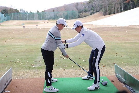 次に、練習場へ移動して笹生選手によるゴルフレッスンを実施しました。まずはお手本として7番アイアン、フェアウェイウッド、ドライバー、トリックショットなどを笹生選手が打つと、大きな歓声があがりました。その後ジュニアゴルファー一人ひとりのスイングを見ながら、丁寧にレッスンを行っていました。全員のスイングを見た笹生選手は「もうスイングが完成している子も沢山いる」と、驚いていました。