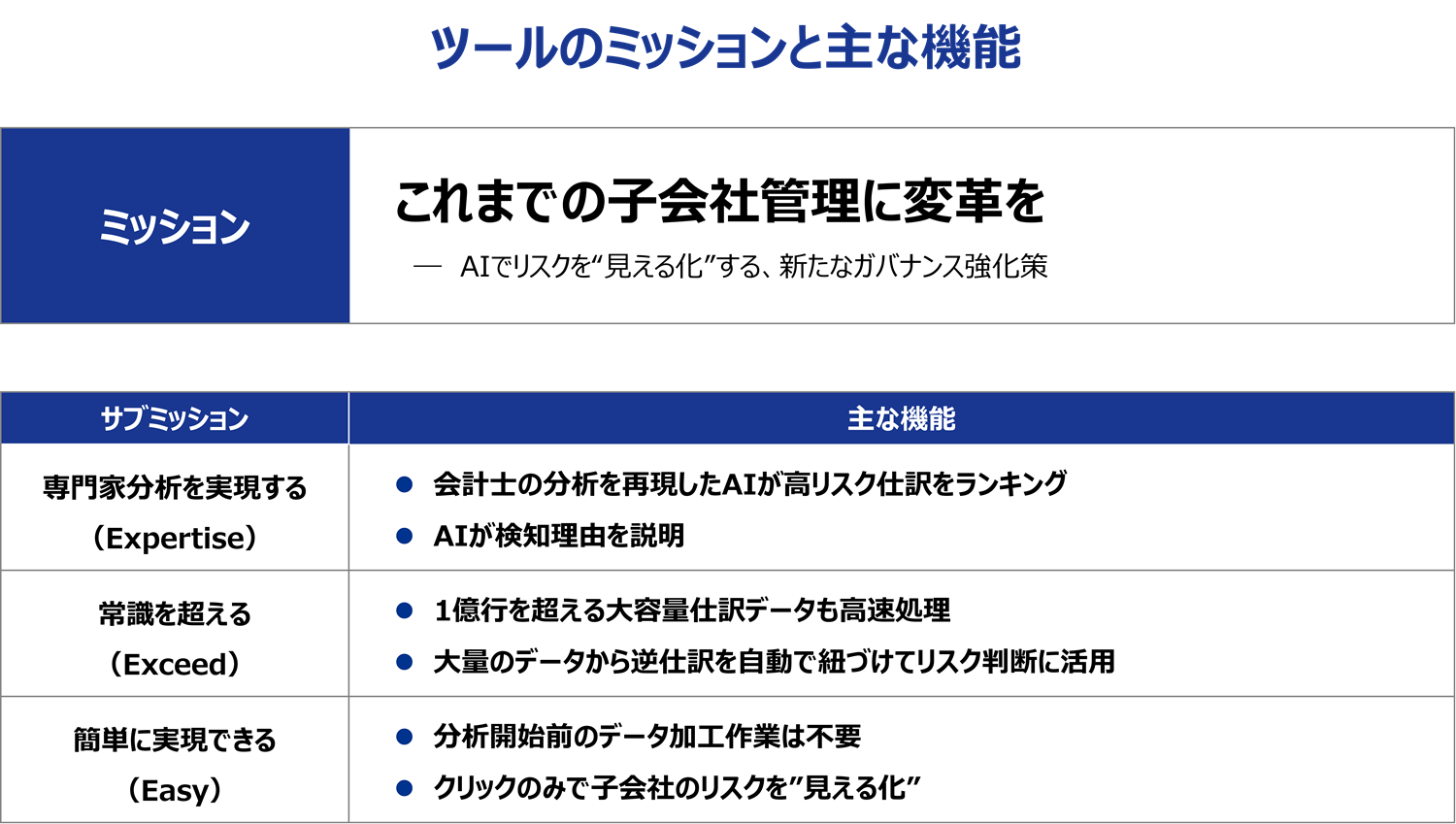 「AI仕訳分析ツール」は、「これまでの子会社管理に変革を」をミッションに掲げ、これまで不可能であった大容量の仕訳データ分析を、簡単なクリック操作のみで実現し、子会社を”見える化”するツールです。これにより、日本企業における子会社管理、経理モニタリング、内部監査などの高度化・効率化を実現します。