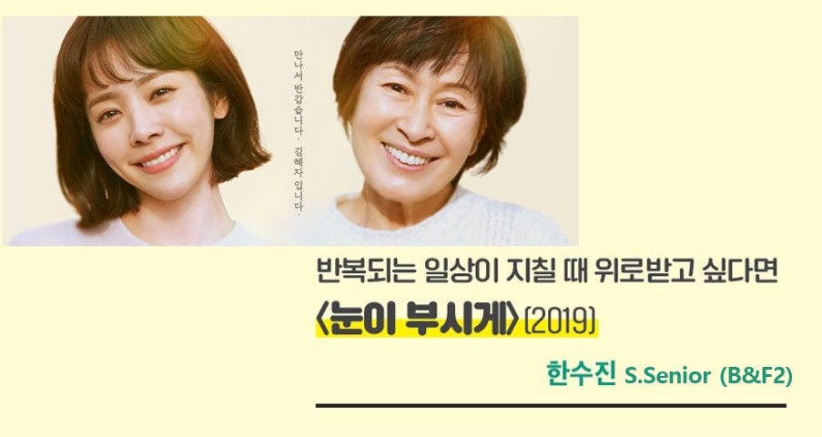 “후회만 가득한 과거와 불안하기만 한 미래 때문에 지금을 망치지 마세요. 오늘을 살아가세요. 눈이 부시게... 당신은 그럴 자격이 있습니다.” 이 드라마를 보면 어느 순간에는 보잘 것 없어보이는 내 삶도 눈이 부셨다는 걸, 그리고 지금은 그저 지나칠 뿐인 삶의 몇몇 장면들이 먼 미래에 돌아보면 눈이 부실 순간들이라는 걸 알 수 있게 해줘서 추천하고 싶은 작품입니다