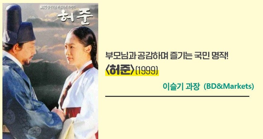 단순한 의학 드라마가 아니라 ‘성실함과 헌신이 결국 길을 만든다’는 메시지를 전해주는 작품입니다. 끝없는 시련 속에서도 환자를 향한 진심 하나로 의학의 길을 완성해가는 허준의 모습은 회사 생활에서 매일 부딪히는 과제들과도 닮아 있습니다. 무엇보다 “사람을 살리는 것은 약이 아니라, 사람을 향한 진심이다.”라는 명대사는 회사에서 동료와 협업할 때, 결국 중요한 것은 성과만큼이나 서로를 향한 믿음과 배려라는 생각을 일깨워줍니다.