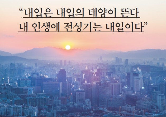 세계적인 명화 <바람과 함께 사라지다>에서 비비안 리(스칼렛 오하라 역)는 내일 아침 먹거리조차 없는 절망적인 상황에서 외친다. “내일은 내일의 태양이 뜬다 (Tomorrow is another day)!” 지금 이 시간에도 반지하 단칸방에서 저 유명한 “The Best day is yet to come(최고의 날은 아직 오지 않았다)”이란 글귀를 부여잡고 미래를 꿈꾸는 수많은 이들이 있다.