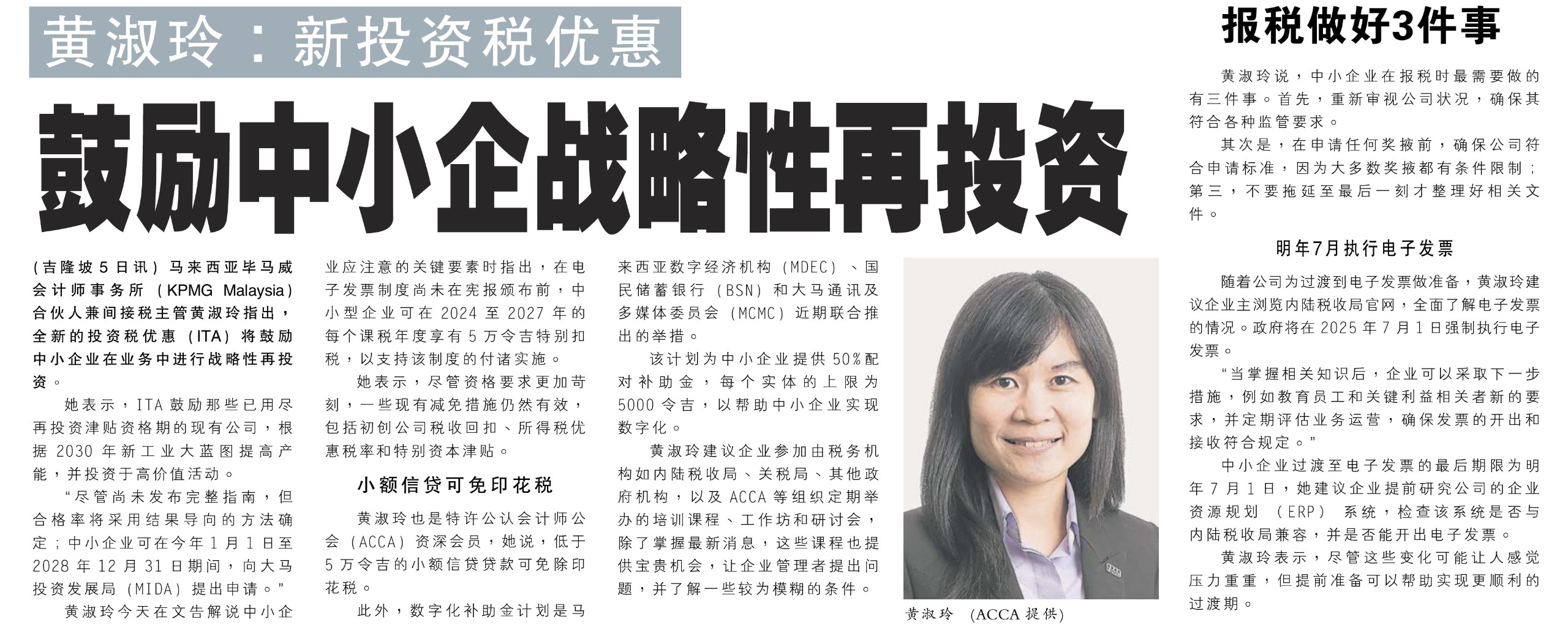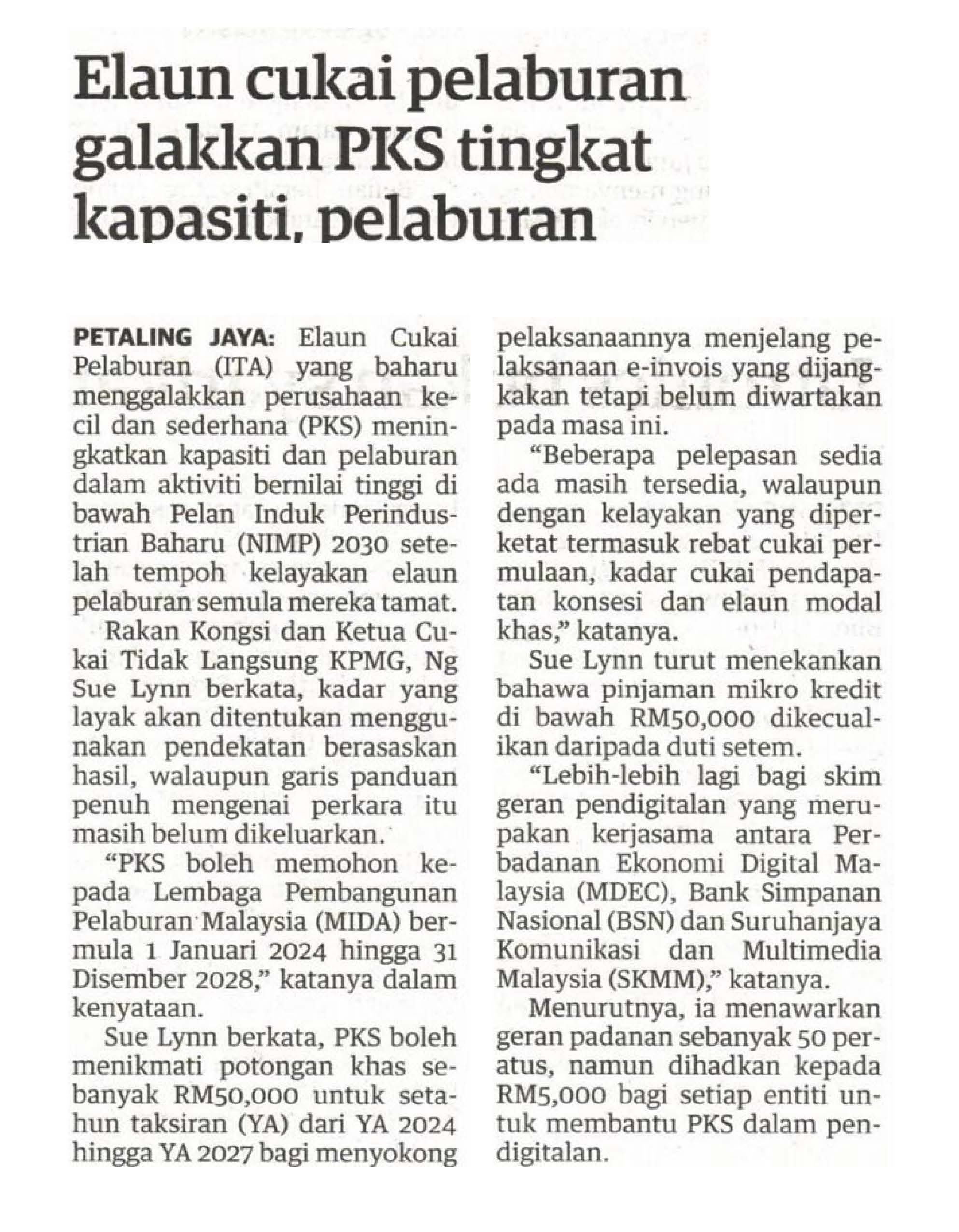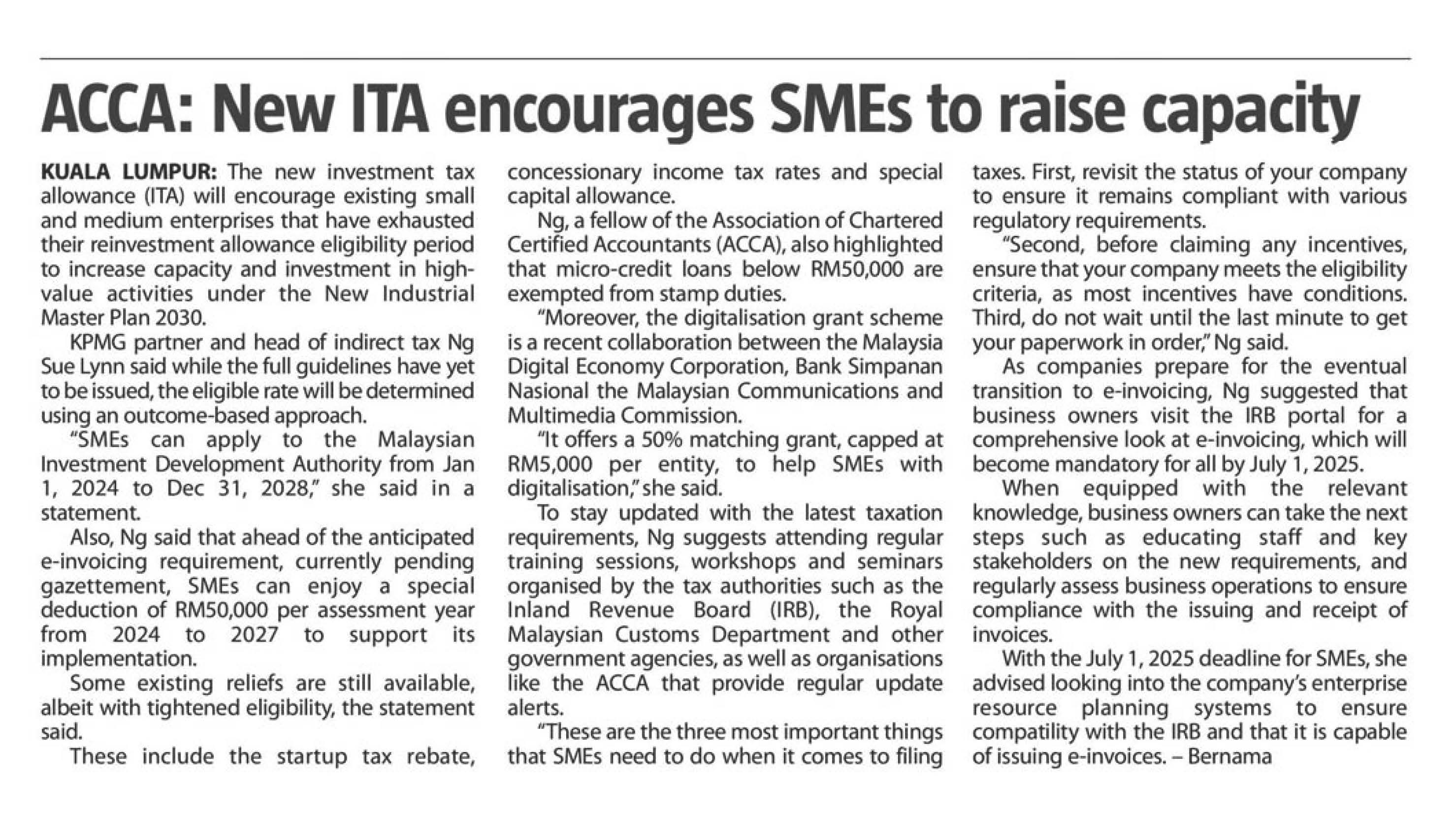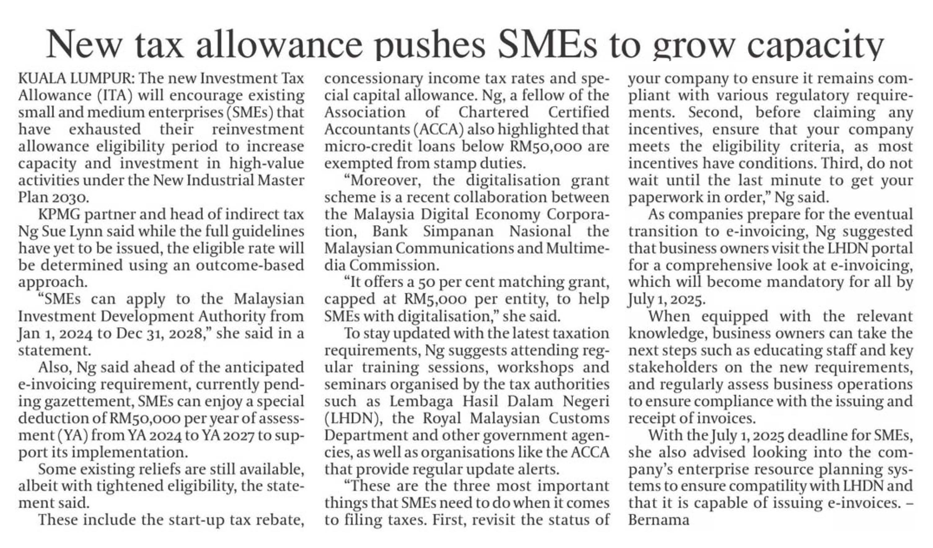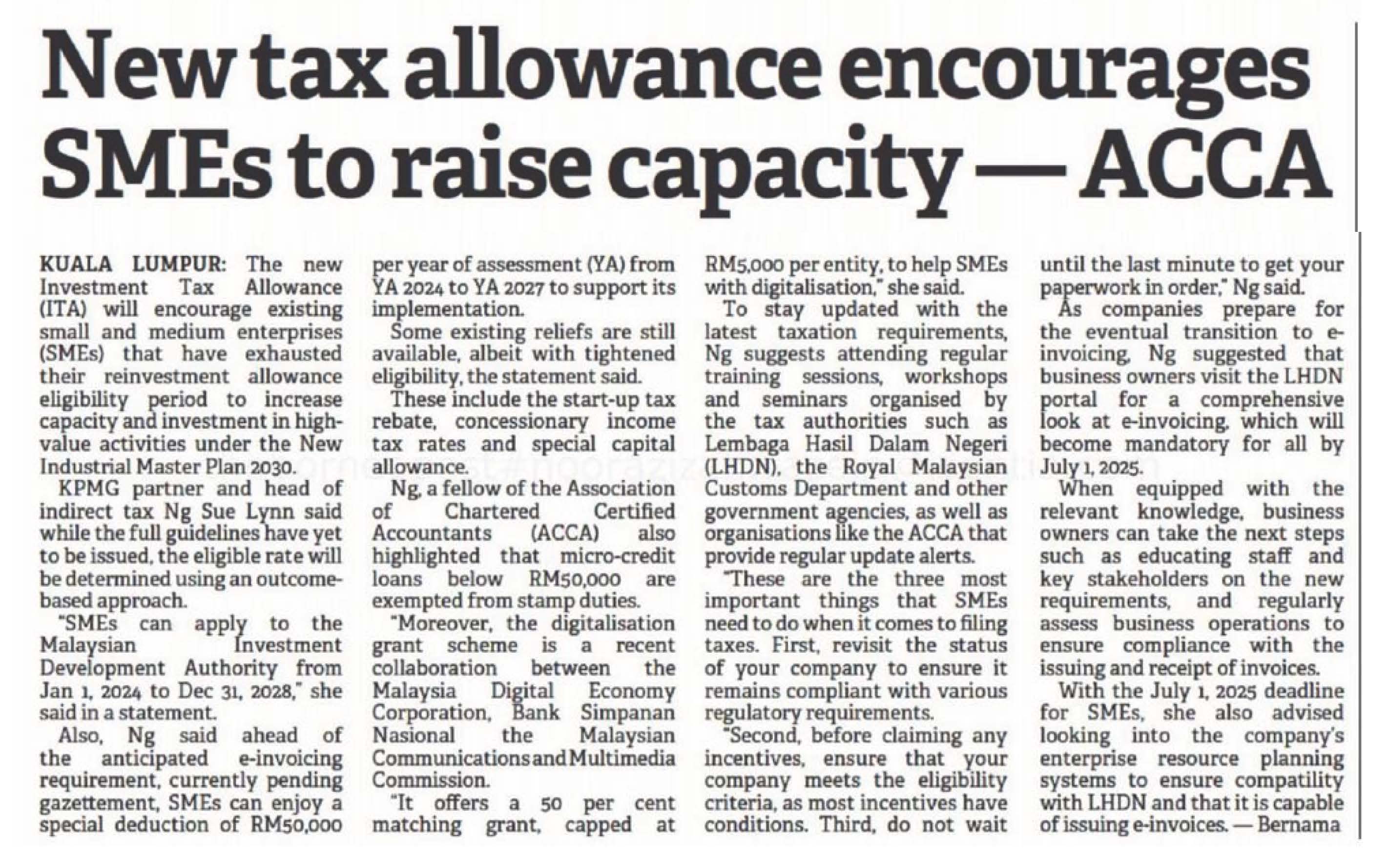 In an interview with the Association of Chartered Certified Accountants (ACCA) Malaysia, insights from Ng Sue Lynn, Head of Indirect Tax at KPMG in Malaysia, were captured by multiple media outlets. Highlighting the latest tax incentives and their implications on local SMEs, she opined that for SMEs to remain ahead of the curve, they should assess their businesses to ensure compliance and eligibility for incentives, as well as prepare their paperwork ahead of time.