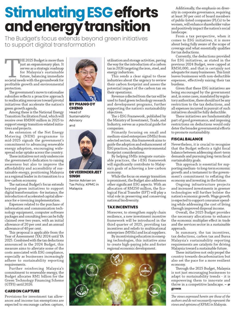 In this commentary, Phang Oy Cheng, Head of ESG and Sustainability Advisory, alongside Dr. Veerinderjeet Singh, Senior Advisor on Tax Policy at KPMG in Malaysia, shared their insights on how Malaysia plans to achieve sustainable economic growth through Budget 2025. They discussed the various initiatives introduced, including tax reforms, strengthening supply chain resilience, and investments in green technology, emphasizing that these efforts will not only lay the foundation for a sustainable economy but also drive long-term growth in the trade and services sector.