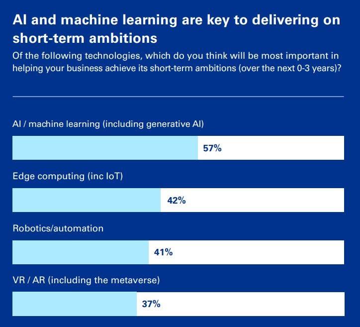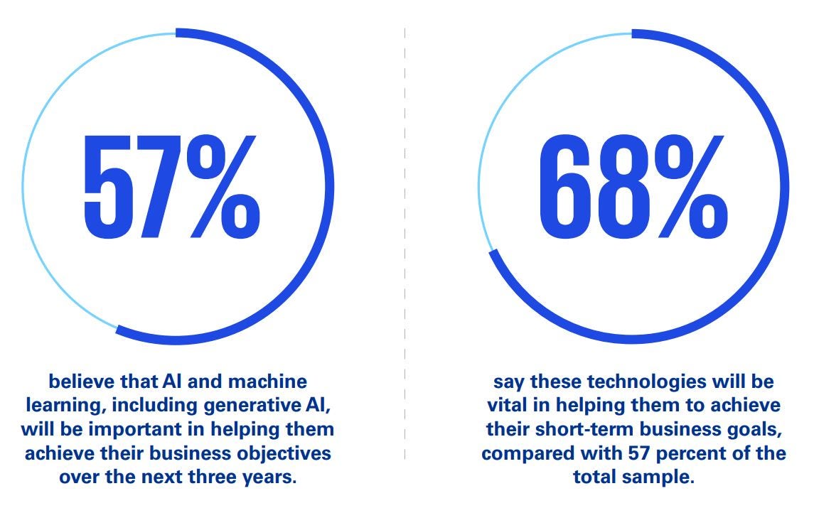 Organizations consider AI and machine learning as the most important technologies for achieving their short-term ambitions, is shown in KPMG’s Global Tech Report 2023. More than half of the technology professionals we spoke to (57 percent) believe that AI and machine learning, including generative AI, will be important in helping them achieve their business objectives over the next three years. This is significantly ahead of the next technology in the rankings: edge computing (42 percent). Among leading businesses where investment in technology is driving confidence and profitability most quickly, AI and machine learning are even bigger priorities. More than two-thirds (68 percent) say these technologies will be vital in helping them to achieve their short-term business goals, compared with 57 percent of the total sample.