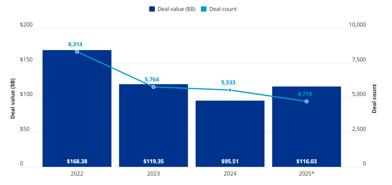 全球金融科技總體資金活動(創投、私募股權與併購) 2022-2025*
