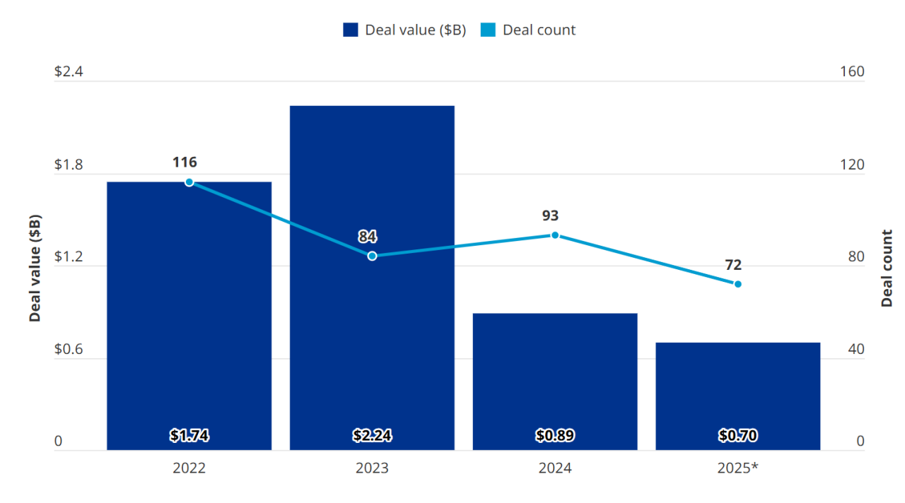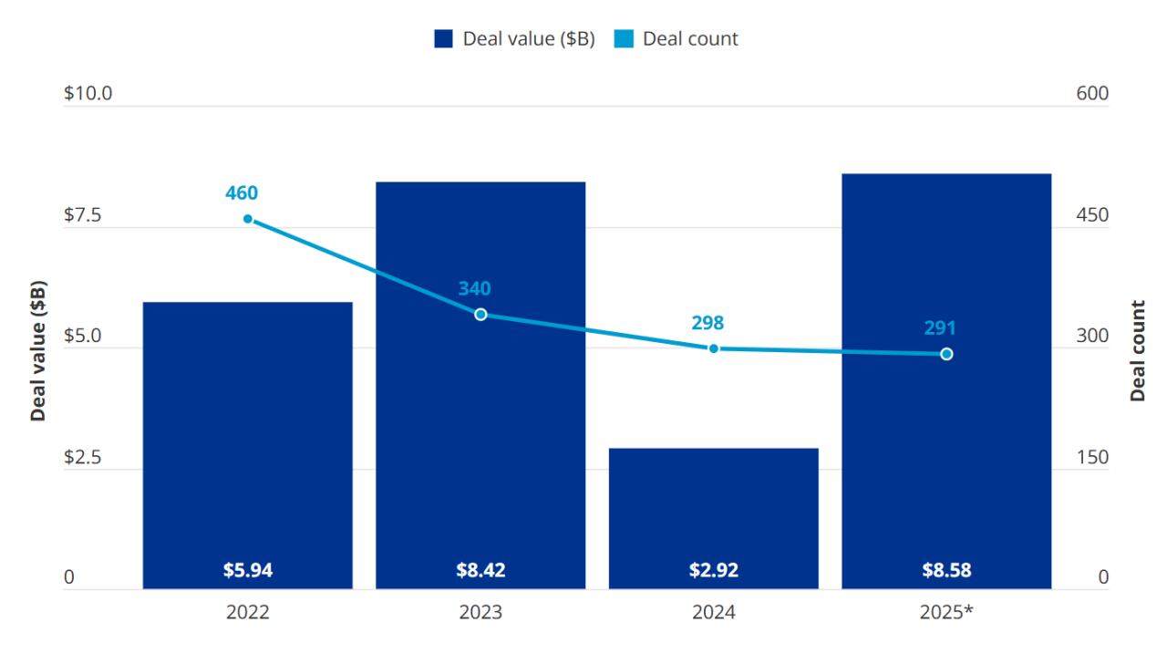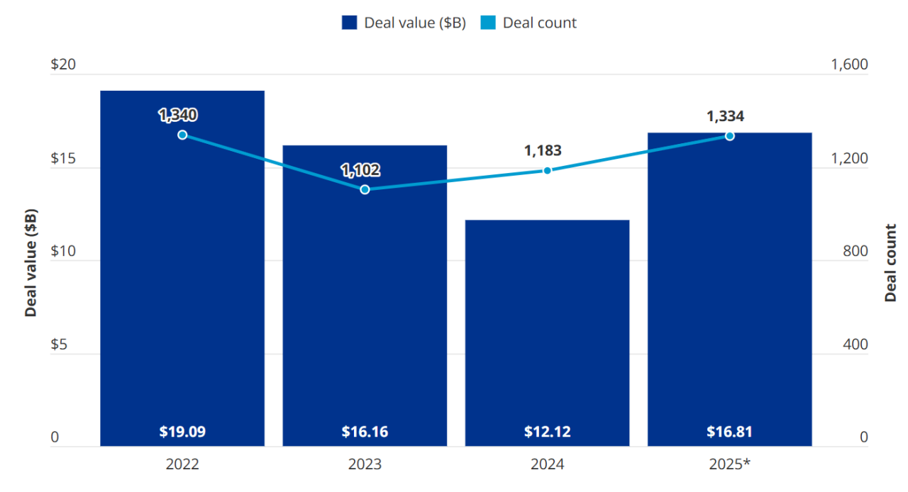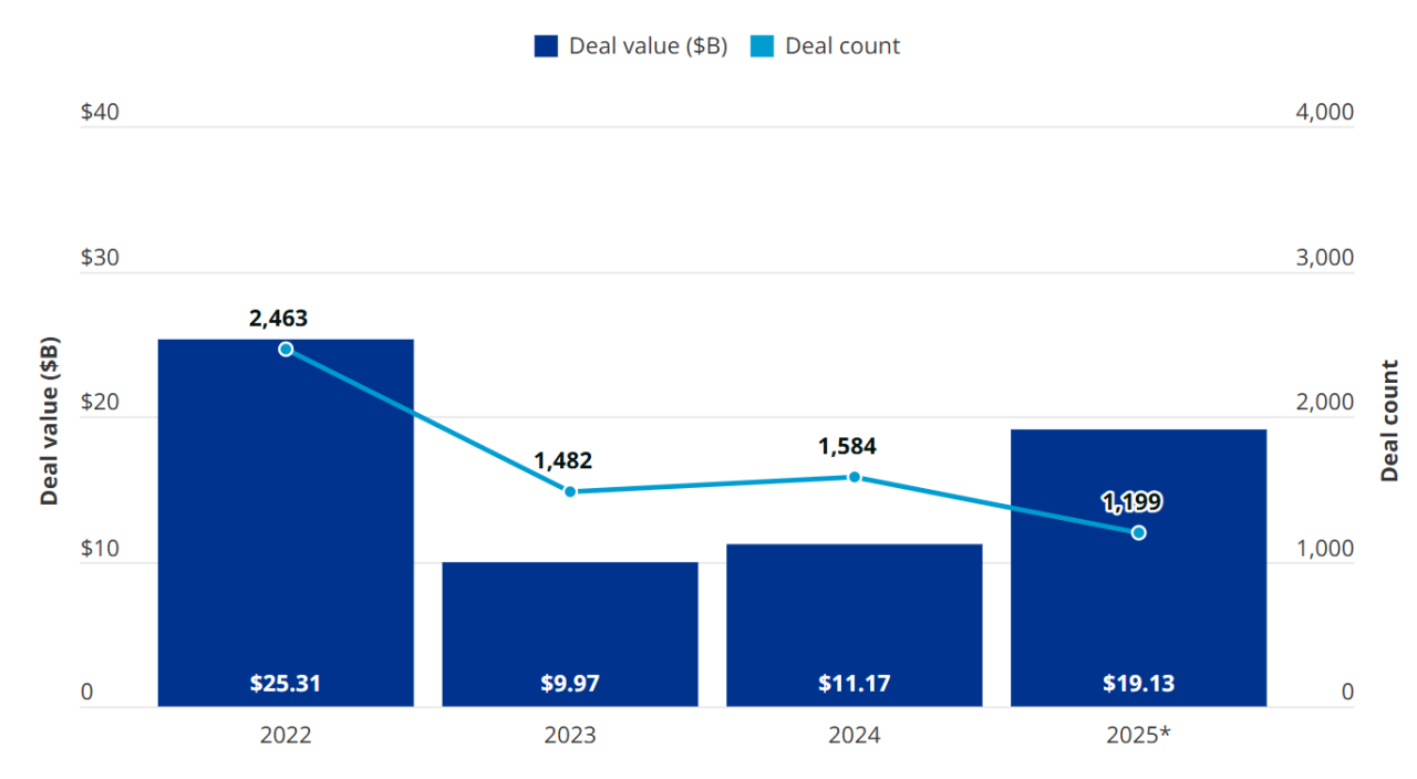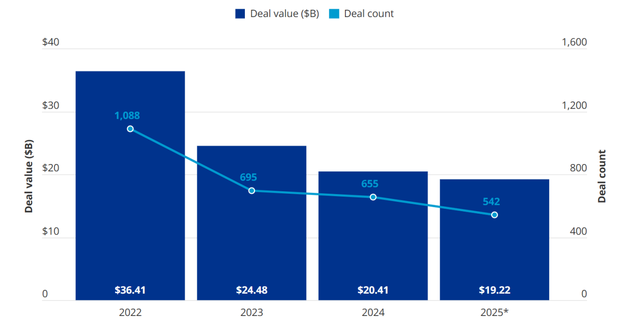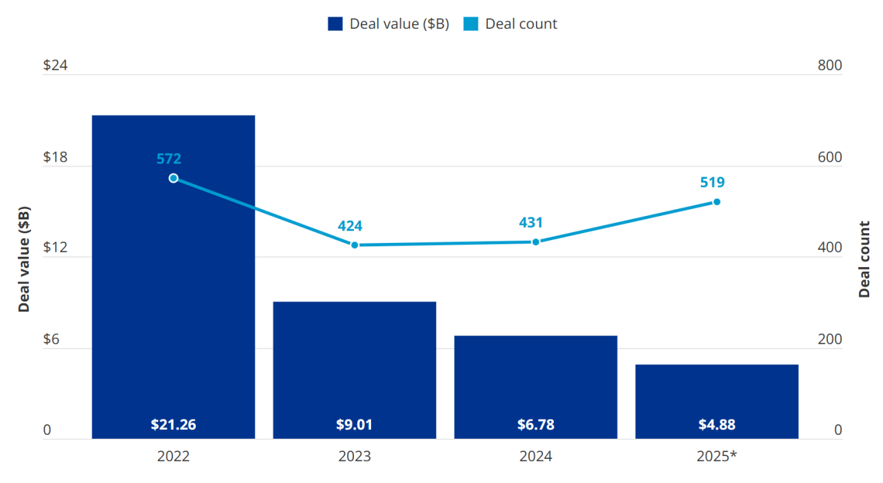 全球支付領域的總體資金活動(創投、私募股權與併購) 2022-2025*