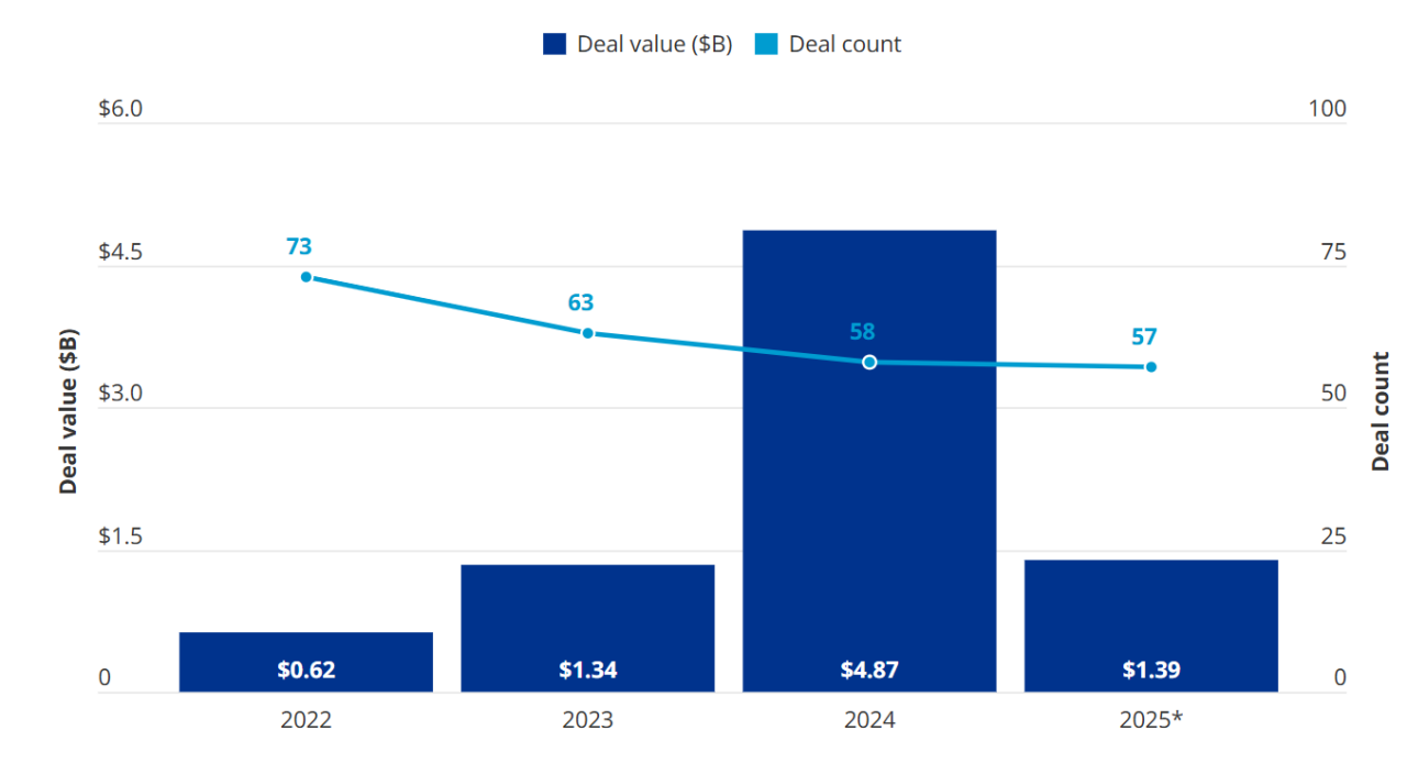 全球數位資產領域的總體資金活動(創投、私募股權與併購) 2022-2025*