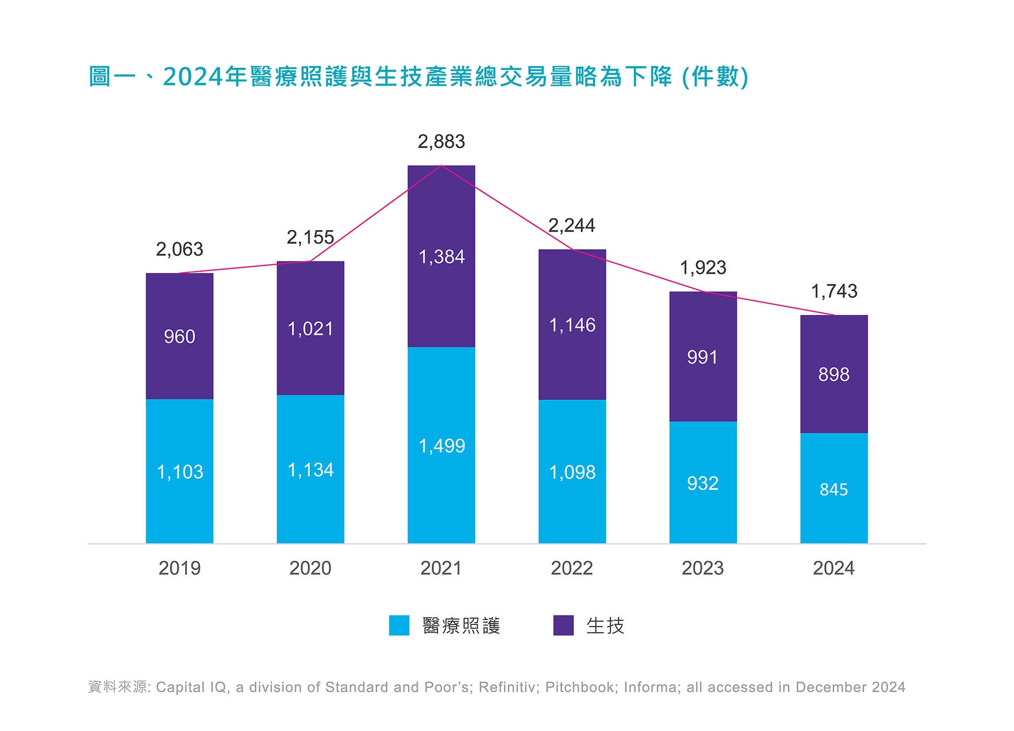 過去一年,總體經濟環境有所改善,為醫療照護與生技產業奠定了穩固基礎,不過,2024年整體投資交易量較2023年稍下滑(參閱圖一),主要是由於經濟發展趨緩以及各國加強監管,導致部分企業放緩了併購活動。