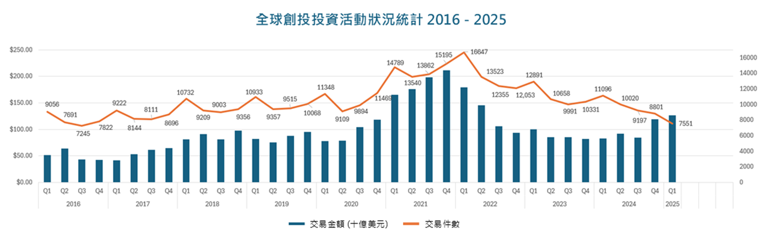 儘管人工智慧領域持續吸引大量資金,推升全球創投投資總額創新高,但交易活動則呈現顯著下滑趨勢。2025年第一季全球創投交易筆數降至7,551筆,較2024年第四季的8,801筆顯著減少,創下歷史新低,僅略高於2016年第三季的7,245筆交易。