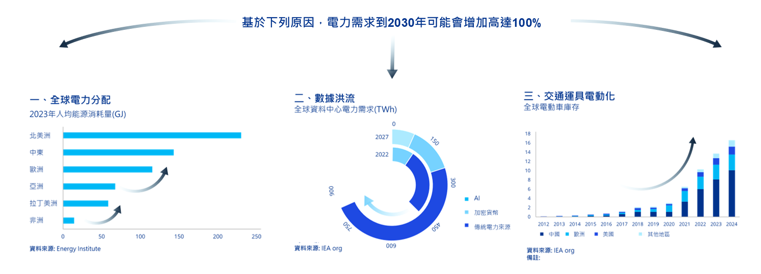 電力需求穩步成長,根據國際能源署(IEA)數據顯示,年成長率約3.4%;種種跡象皆指出,該需求將大幅增加,主要由三個核心驅動因素推動。
