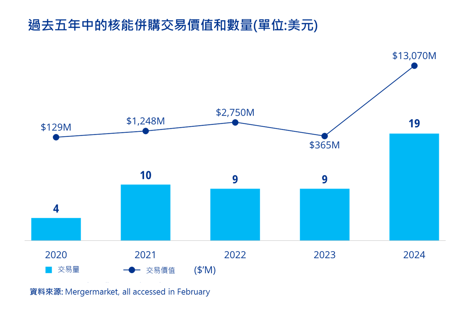 各國企業開始意識到電力安全的重要性,且越來越多投資核能的併購交易。2023年與2024年,許多大型的交易皆發生在能源領域,單是2024年,核能子產業的併購交易量就從2023年9筆增加至19筆,成長了一倍多,累計交易價值也在上升。