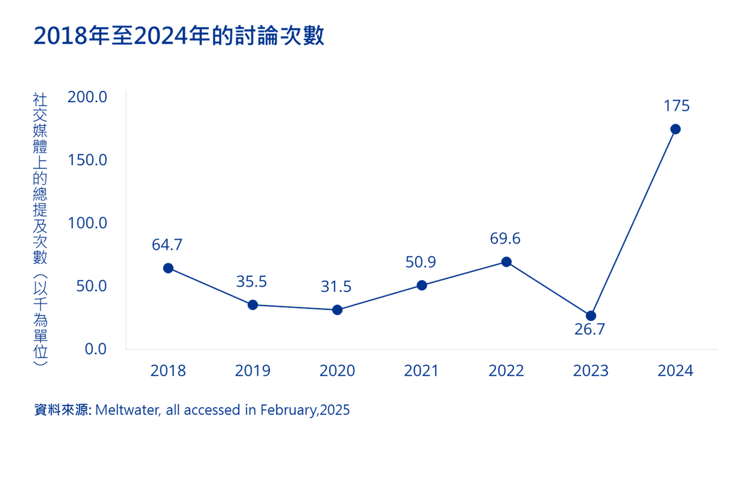 展望未來,預期此一趨勢將加速,因科技公司尋求永續、安全和穩定的能源來源,以為其資料中心和人工智慧模型提供動力。我們可以看到,關於「核能」的討論從2023年的26.7K增加到2024年的174.9K,反映了對能源來源作為可行解決方案的認識和興趣日益增加。