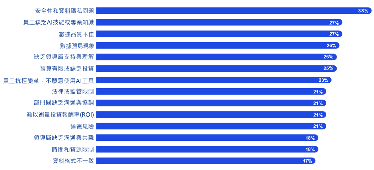 「安全和資料隱私問題」、「員工缺乏AI技能或專業知識」、「數據品質不佳」為應用上三大主要挑戰