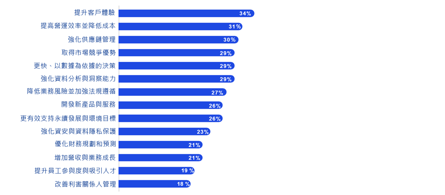 「提升客戶體驗」、「提高營運效率並降低成本」、「強化供應鏈管理」為零售業從AI應用獲得的三大主要益處