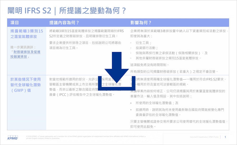 對IFRS S2「氣候相關揭露」針對性的修正可能改變公司揭露排放之方式。利害關係人(包括主管機關、編製者以及投資者)對IFRS S2之回饋意見聚焦於「若闡明則可協助其適用準則」的領域。作為因應,國際永續準則理事會(ISSB)正提議對下列領域進行修正:
