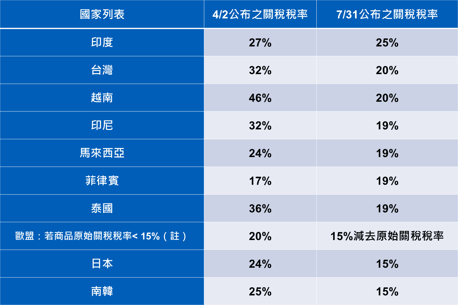 - 歐盟:若歐盟商品的原始關稅稅率低於15%,則加徵額外稅率,使總稅率達到15%;若原始關稅稅率大於15%,則不額外加徵,仍維持適用原關稅稅率。