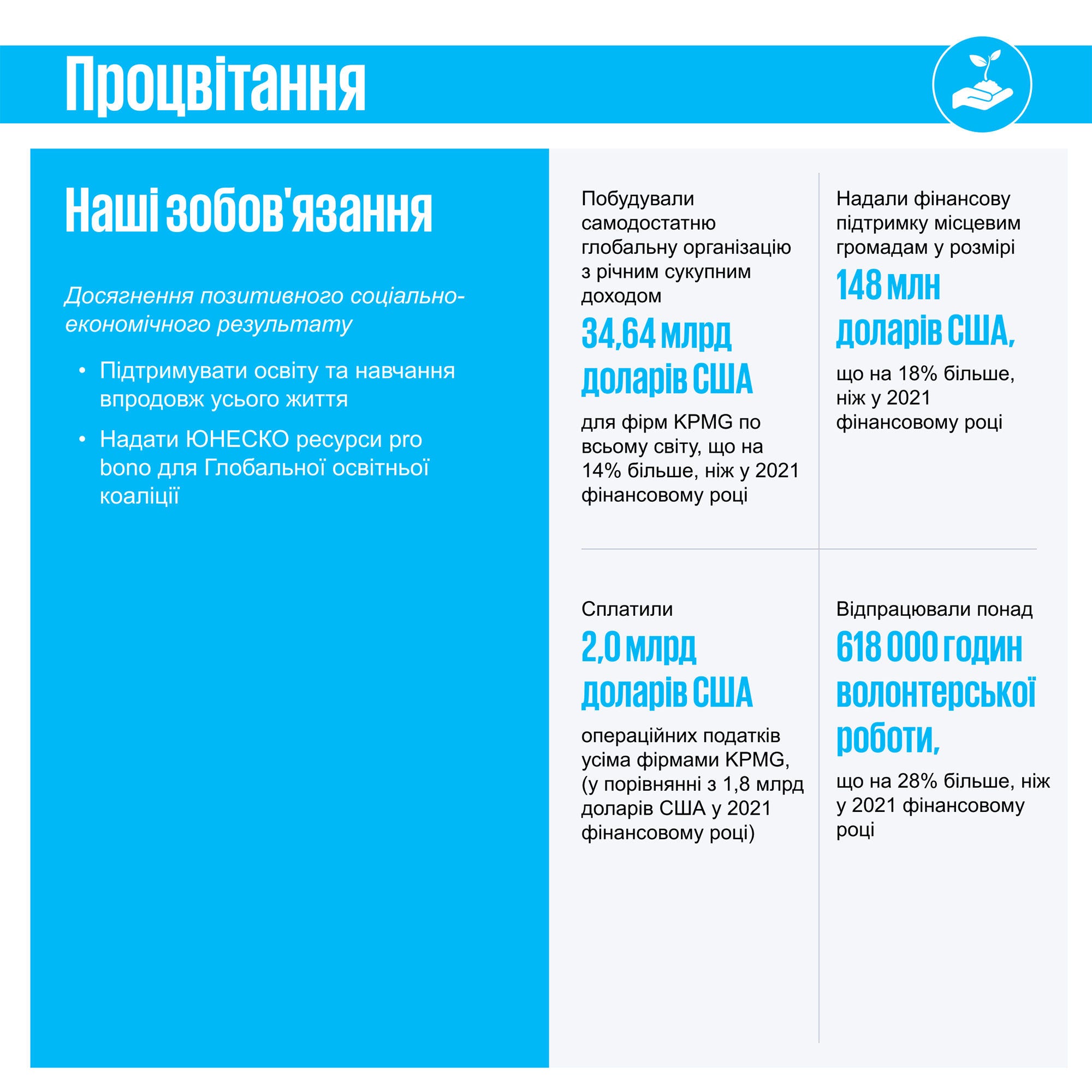 Ми продовжуємо працювати разом, щоб домогтися значущих змін, і Our Impact Plan – це наша дорожня карта для досягнення цієї мети. Дякуємо, що знайшли час дізнатися більше про те, як KPMG змінюється – Together. For Better", – Білл Томас, глобальний голова та виконавчий директор, KPMG International.