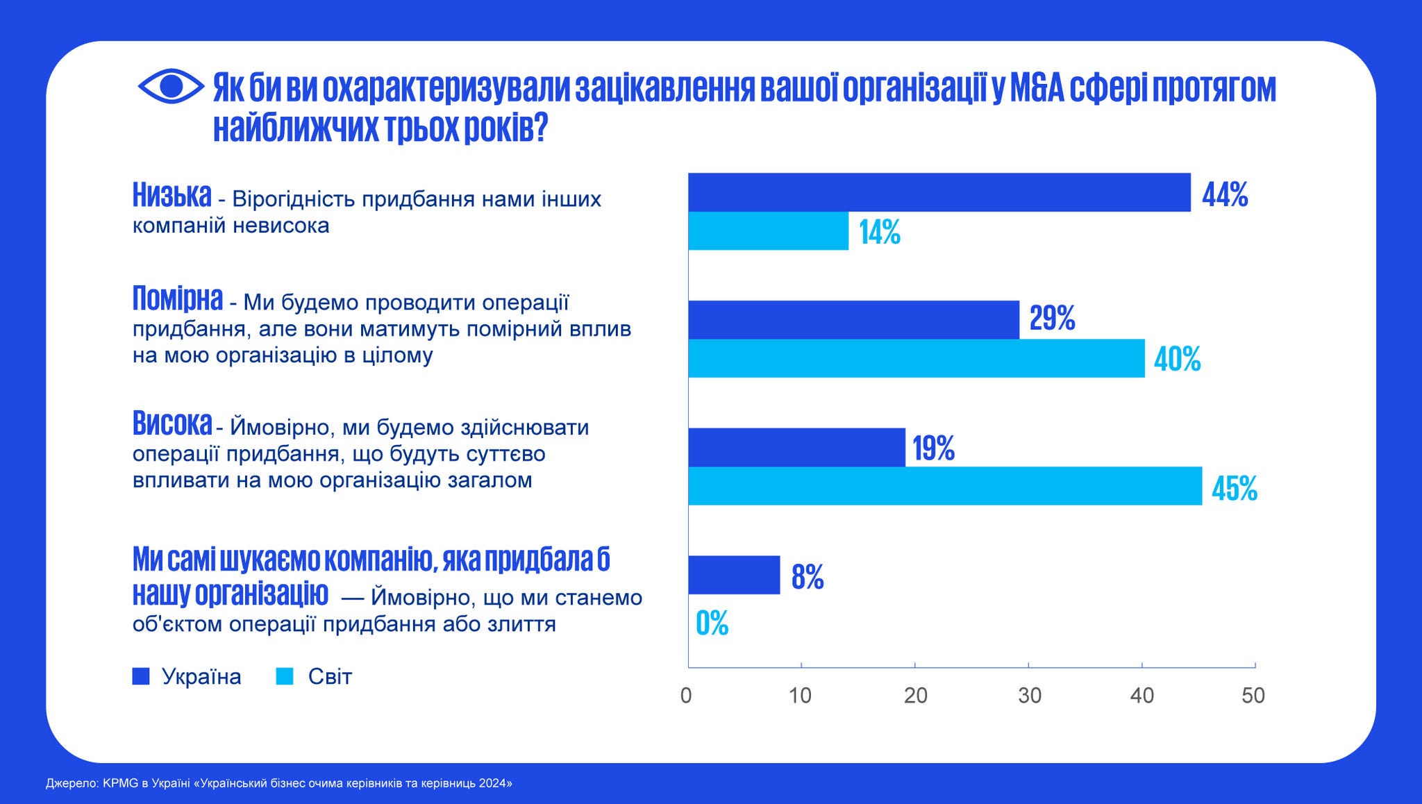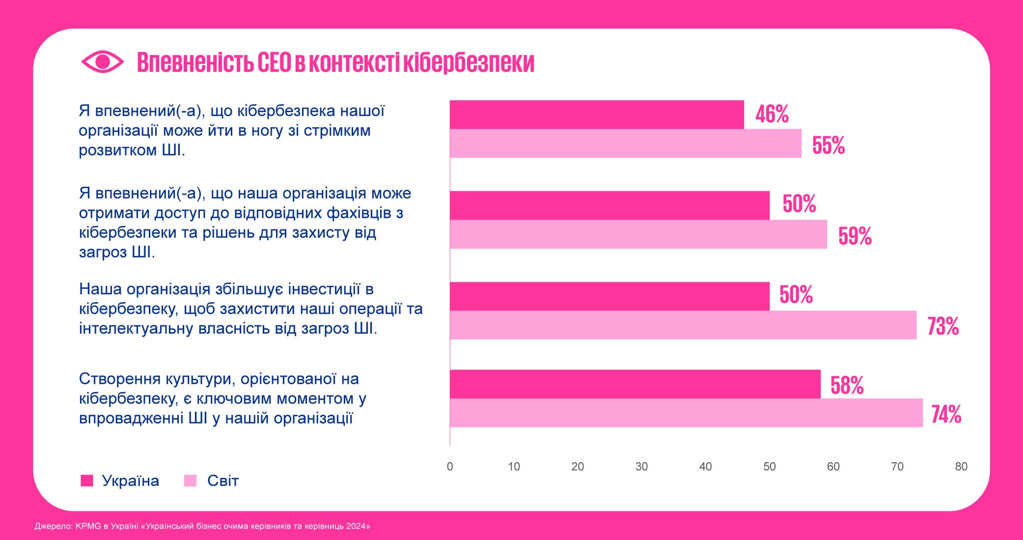 Шосте дослідження KPMG CEO Outlook в Україні проводиться в рамках глобального дослідження, яке вже 10 років є важливим джерелом інсайтів для керівників по всьому світу. Глобальна версія дослідження цьогоріч залучила понад 1 300 CEO з різних країн та бізнес-сегментів, що дає можливість оцінити найбільш актуальні тенденції та стратегічні пріоритети на світовому рівні.