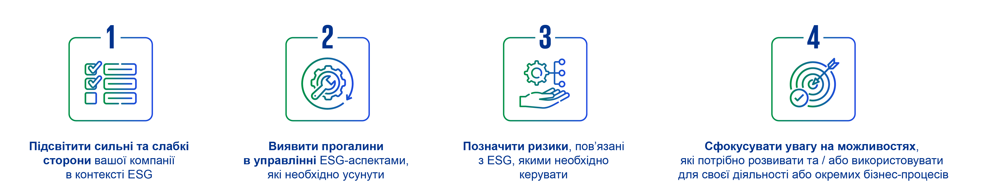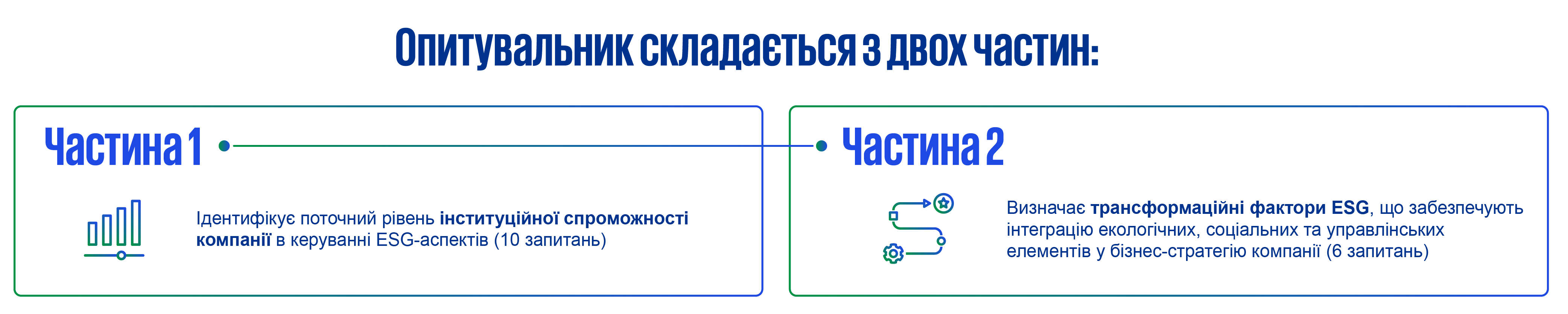Незважаючи на «нефінансовий» характер ESG, неефективна система управління ESG-аспектами може мати суттєвий репутаційний вплив та фінансові наслідки для бізнесу. Відповіді на запитання опитувальника відображають вашу суб'єктивну думку, але дозволять зрозуміти поточний стан елементів управління ESG-практиками в компанії та визначити, які із них потребують удосконалення та впровадження відповідних змін для успішної ESG-трансформації.