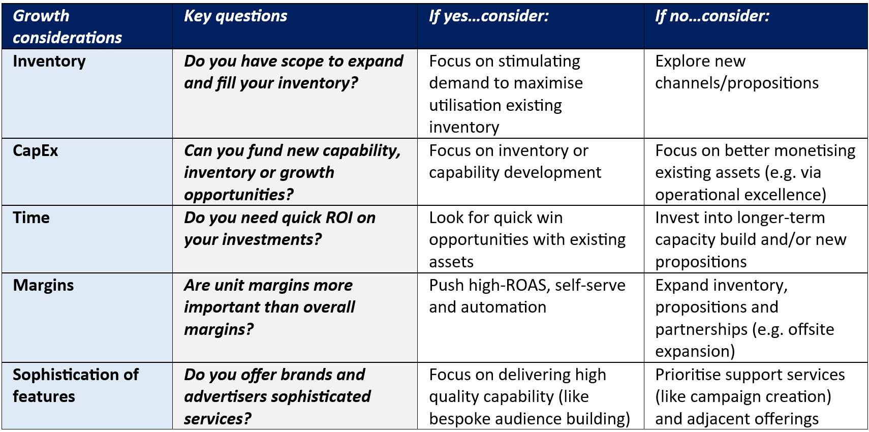 Considerations for growth: Key considerations going forward
